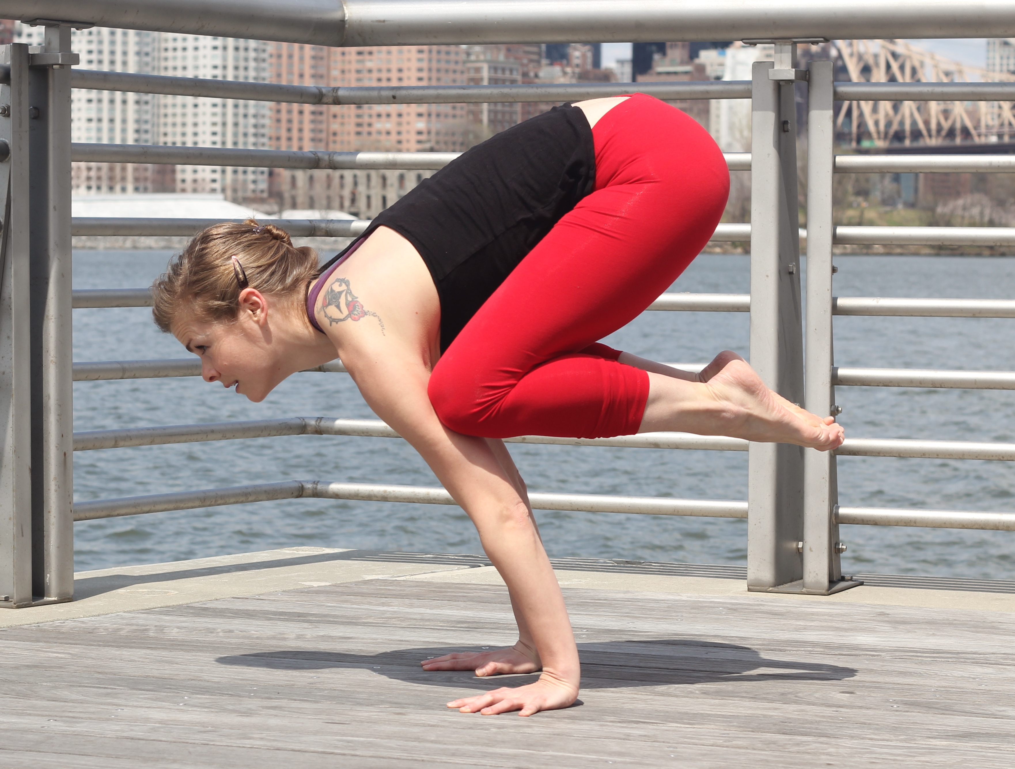 Alignment cues: Crow: Elbows should be stacked directly over the wrists. Shoulders move forward over the finger tips. Use the inside of the knees to squeeze in towards center while the elbows push out against the knees to create stability through opposition. Belly hollows and pulls up and in to create lift in the abdomen (Uddiyana Bandha).